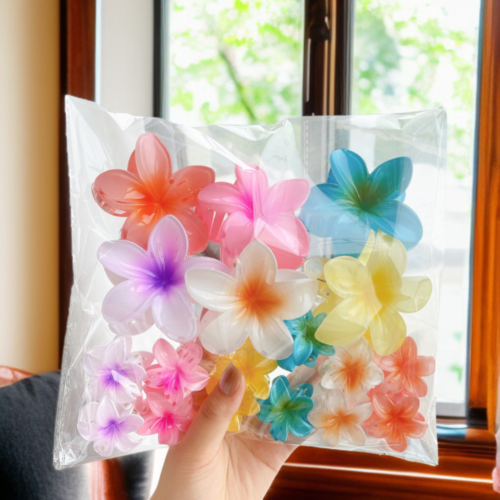 ● 精選18件套雞蛋花抓夾,漸變花朵設計,讓您的髮型瞬間增添浪漫氣息,適合日常及各種場合搭配。